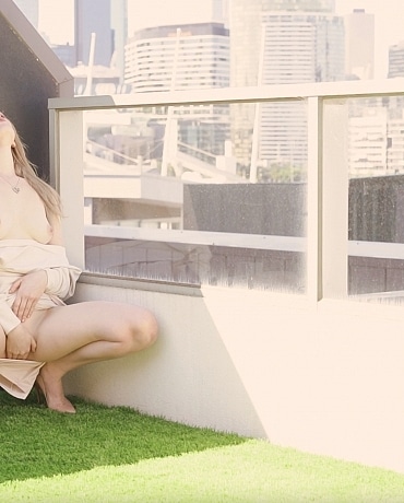 Charlie is sitting on a rooftop in the centre of Melbourne when a breeze gently stirs her face. She smiles into the wind and starts caressing herself where the wind stroked her. Caresses turn to pleasurable strokes, and she slides down the wall of the rooftop patio to rest on the grass in ecstasy. She takes off her shoe and uses it to delve deep inside her pussy or to rub her clit firmly. With the pattern of grass etched into her butt cheeks, she cums publicly and without care for anyone who might witness her act of self love.