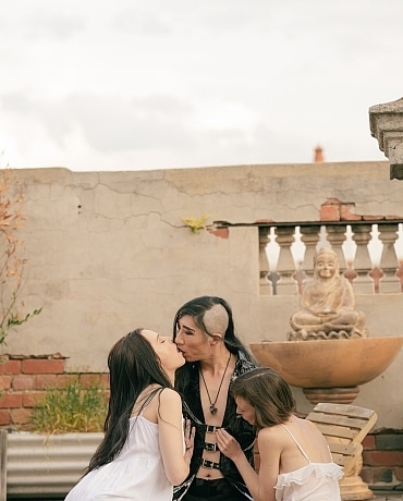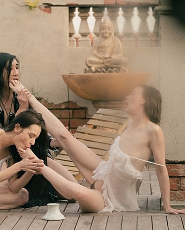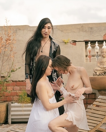 Ivy and Eden sit, vessels for Sai to weave with. Sai covers the babes in lube before they fuck intentionally under the dying light. This is a magical photoset.